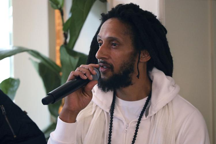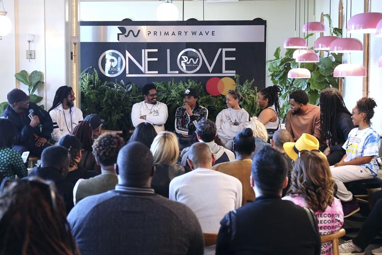 Julian Marley, second from left, Rohan Marley, Joshua Omaru Marley, Mystic Marley, Zuri Marley, Nico Marley, Skip Marley and Shacia Marley participate in the Q&A panel at the Marley Brunch