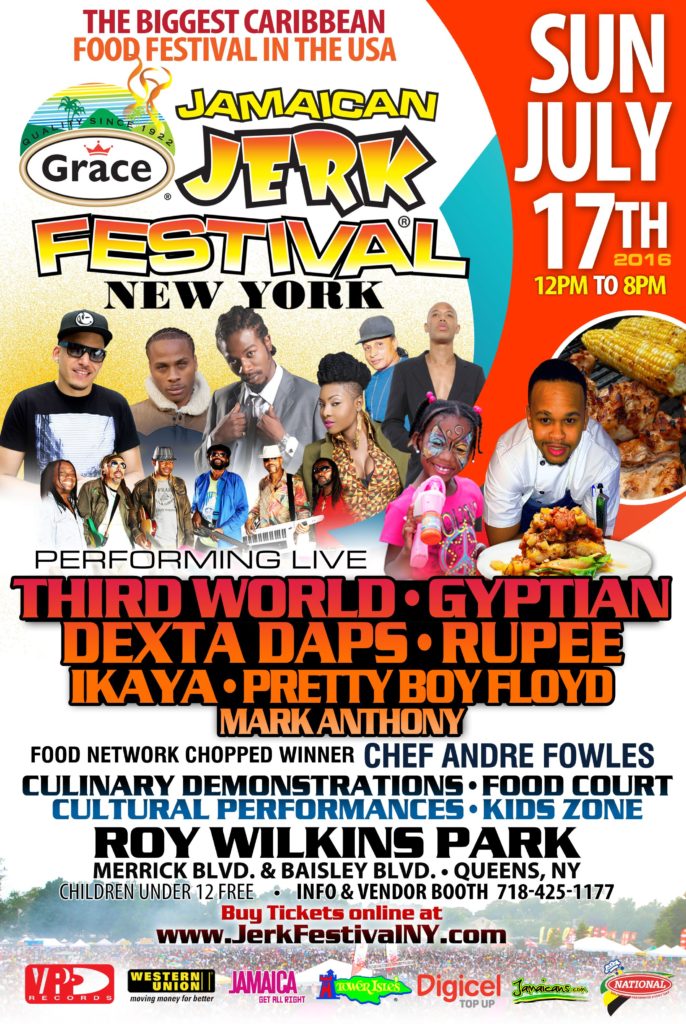 The 6th Annual Grace Jamaican Jerk Festival New York is presented by Jamaican Jerk Festival NY, LLC, in association with VP Records. Sponsors are Grace Foods, Western Union, Continental Bakery, Vitamalt, Power 106, Reggae King Radio, Street Hype and Tower Isle Patties.