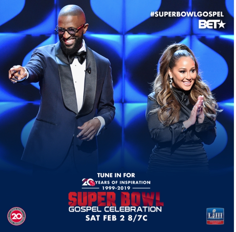 Returning to BET Networks for the sixth consecutive year on February 2, 2019, The 20th Annual Super Bowl Gospel Celebration. This year’s celebration is hosted by National radioand TV personality Rickey Smiley and singer and TV personality Adrienne Bailon Houghton. The annual NFL-Sanctioned event, which took place during Super Bowl LIII week, will air on BET Saturday, February 2, 2019 at 8PM ET/PT.