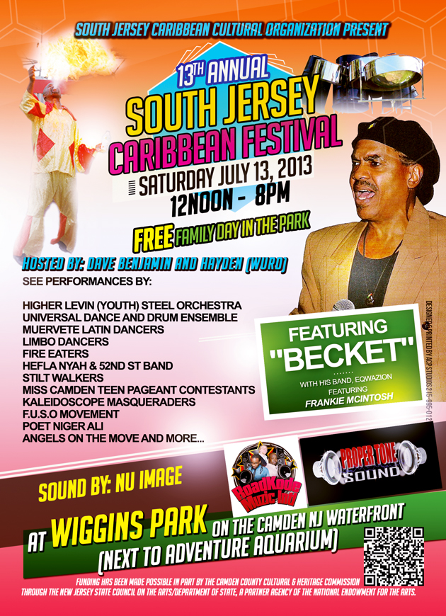 This years event will feature St. Vincent & Grendadines legendary Soca artist BECKET performing hits such as Teaser, Small Pin, Gal Ah Rush Me, and Carnival History. You will experience Caribbean culture at its best. The Festival will include a Steel Pan Band, Limbo dancers, Fire Eating, Stilt Walkers, Latin Dancer and much more. The 2013 Honorees will be Ewart Rouse, a Trinidadian Author and Community Activist for the sport of Cricket in South Jersey and Robert and Wanda Dickerson of the Universal Drum and Dance Ensemble.