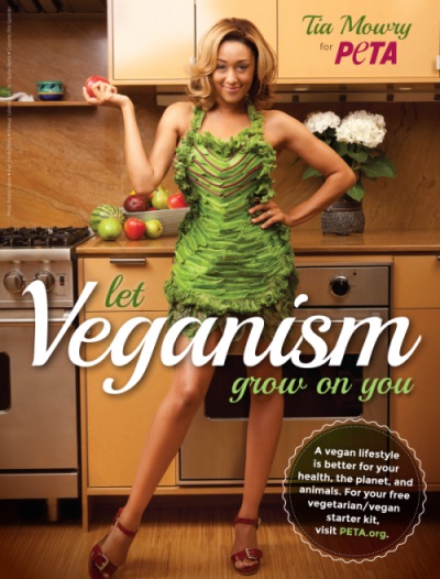 Actress, Hollywood mom and reality star diva Tia Mowry promotes veganism with the ultra controversial animals rights activism group PETA (People for the Ethical Treatment of Animals) . In a historic and first of it’s kind photo shoot with PETA, Tia shows off her post baby figure in a gorgeous ‘happy homemaker’ style apron made completely of vegetables!