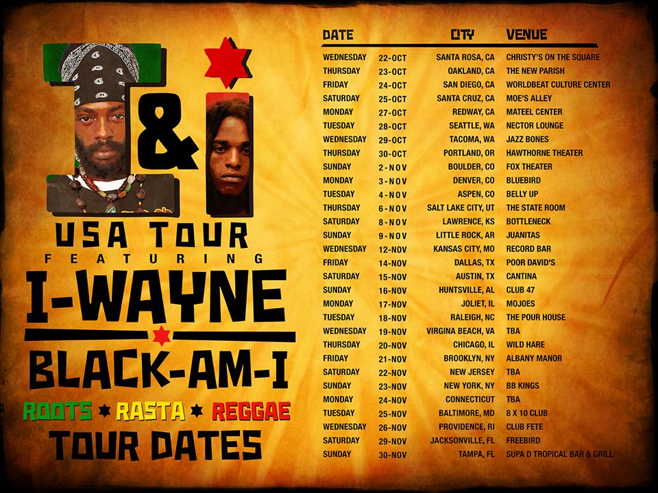 The newest recruit on the Marley-owned Ghetto Youths International label Black-Am-I teams up with I Wayne, one of today’s most pivotal figures in roots reggae, on the I&I Tour that spans over 30 cities across the United States throughout October and November 2014. In Rastafarian culture, I&I represents the oneness between the human and the divine, so the title only seemed fitting for two of Jamaica’s hottest roots reggae artists who are spreading the conscious movement.