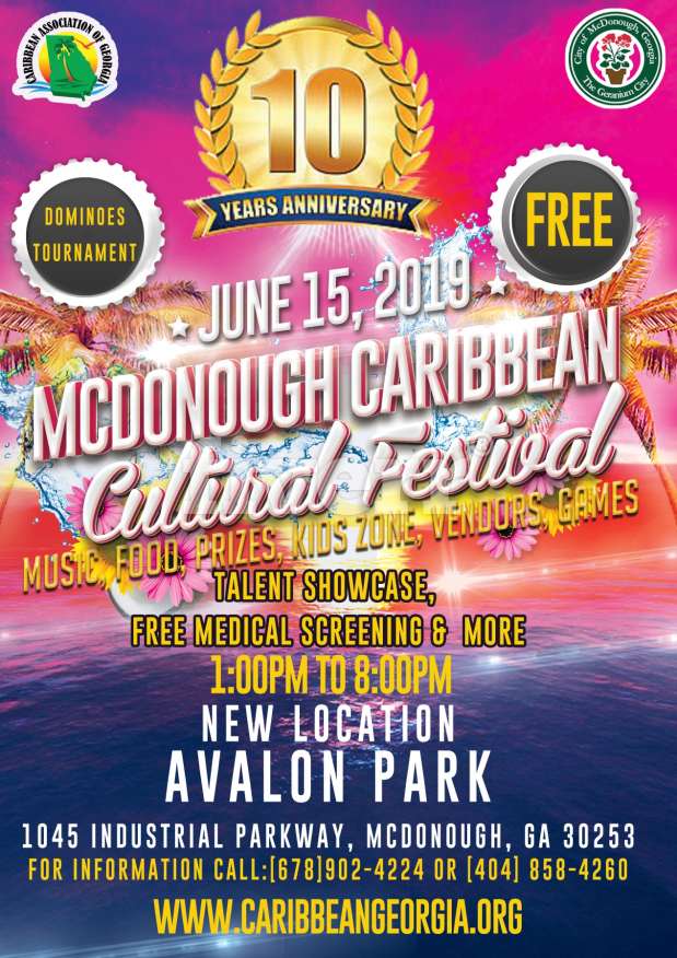 The Caribbean Association of Georgia, Inc., (CAG) celebrates 10-years of serving the community during the 9th Annual McDonough Caribbean Cultural Festival, June 15, 2019 at the newly renovated Avalon Park, 1068 Industrial Parkway McDonough, GA 30253 from 1:00p.m. to 8:00p.m. The event is free and open to the public. It is one of three premiere events sponsored by the City of McDonough and one of the largest held there each year. In honor of 10 years of service, the Caribbean Association of Georgia is pulling out all the stops with an action-packed day of entertainment, contests, vendors, food, music and games. It will all culminate in a daylong experience that celebrates the beauty, impact and contributions of metro-Atlanta’s Caribbean American community.