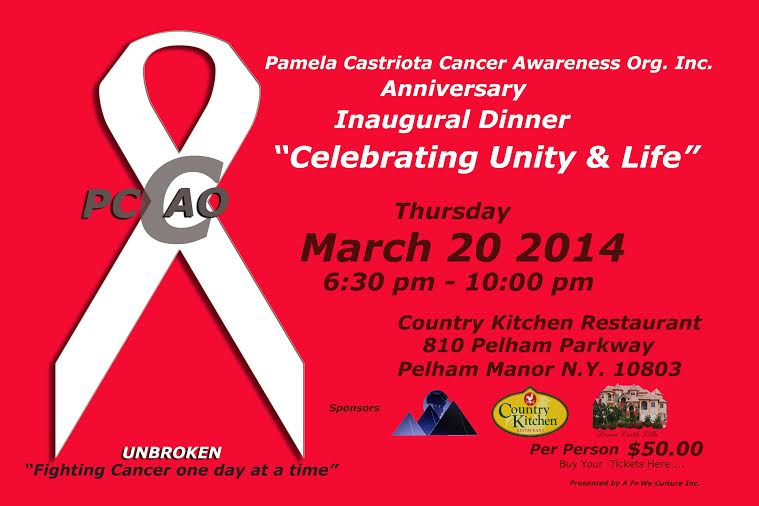 The Pamela Castriota Cancer Awareness Organization Inc., (“PCCAO”), in association with A Fe We Culture Inc., and Country Kitchen Restaurant, will host “Celebrating Unity & Life” – a fundraiser dinner. This inaugural event also celebrates the organization’s first anniversary and will be held on Thursday March 20, 2014, at the Country Kitchen Restaurant 810 Pelham Parkway, Pelham Manor, NY 10803.