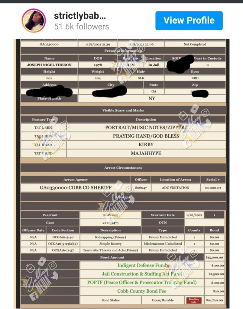 A copy of the charge sheet released on the internet shows that the popular comedian, whose name is Joseph Nigel Theron, was booked around 9:30 PM on felony kidnapping charges, one count of simple battery, which is a misdemeanor, and felony terroristic threats. The document also shows that Majah Hype was born in New York, although he has claimed that he is born on a Caribbean island and has based his entire career on his skits in various Caribbean accents.