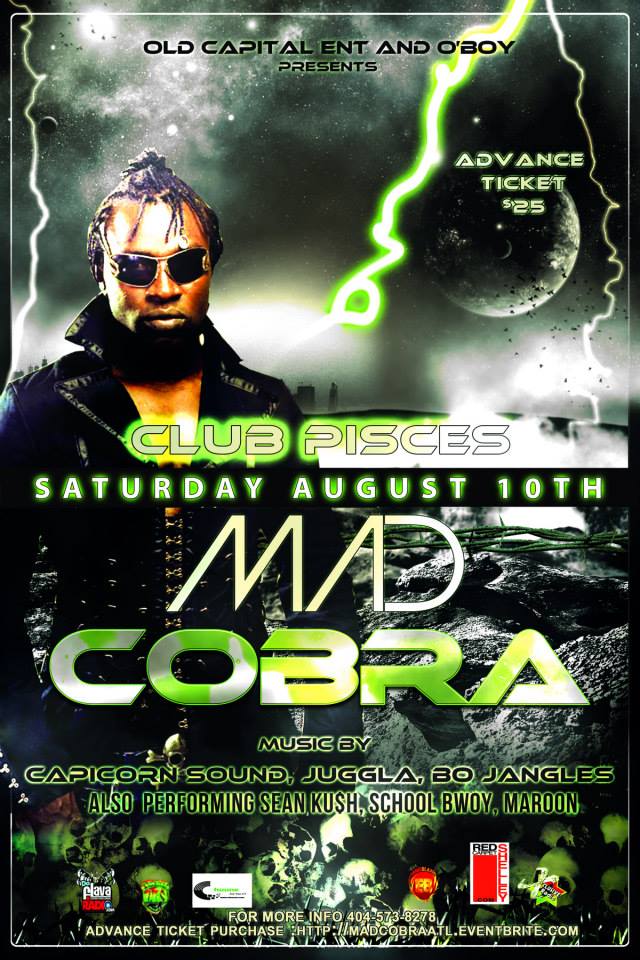 Jamaican reggae dancehall sensation Mad Cobra will be making his long-awaited, highly-anticipated return to Atlanta on Saturday August 10, 2013. Mad Cobra will be shelling down Club Pisces in Stone Mountain with hits like “Yush”, “Gundelero”, “Bad Boy Talk”, “Feeling Lonely” and, of course, “Flex, Time to Have Sex”.