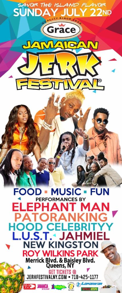 The Grace Jamaican Jerk Festival, NY is sponsored by Moneygram, Laparkan Shipping, Tower Isle Patties, Continental Bakery, The Jamaica Tourist Board, HSBC bank and produced by Jamaican Jerk Festival NY, LLC in association with VP Records.