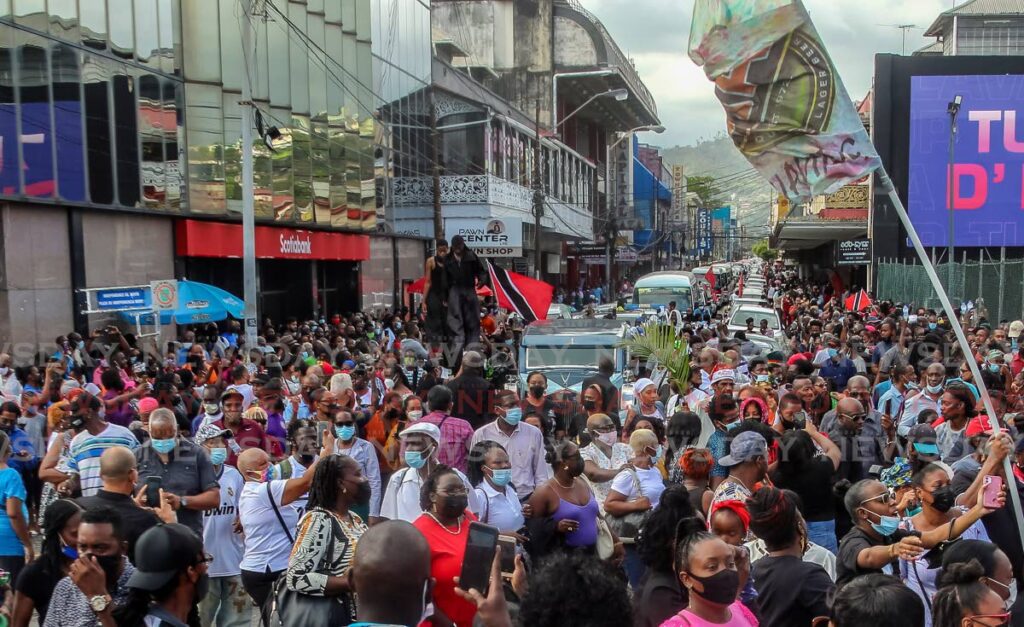It was a Carnival-like atmosphere as hundreds danced, sang and walked along Frederick Street and onto Brian Lara Promenade as they followed the hearse carrying Stewart’s body. The life of the popular soca artiste was celebrated by friends, family, fellow musicians and fans alike.
