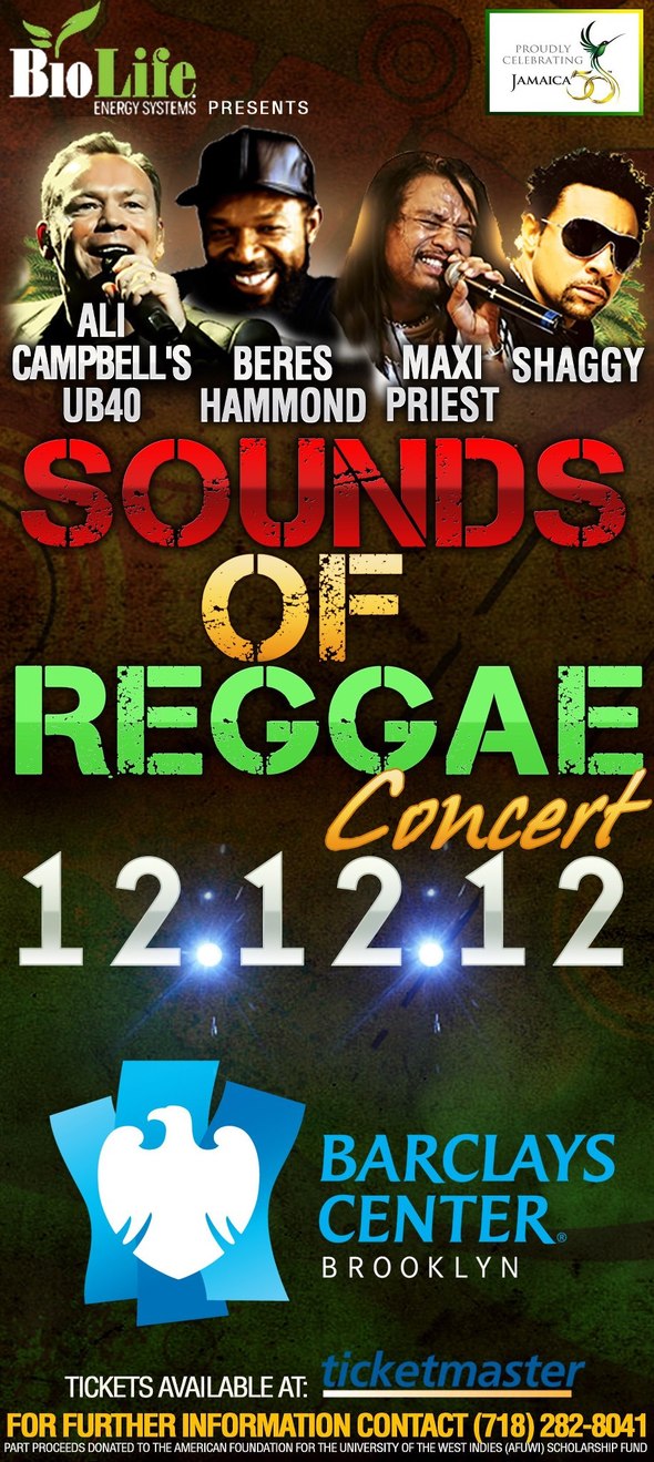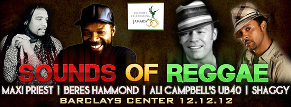 Don’t miss the first Historic Reggae Concert at the new Barclays Center, “Sounds of Reggae” TONIGHT Wednesday, December 12, 2012, featuring four of the brightest stars in the reggae constellation; Internationally known artiste-Ali Campbell’s UB40, Jamaica’s lovers rock – Beres Hammond and Grammy Award winners Maxi Priest and Shaggy.