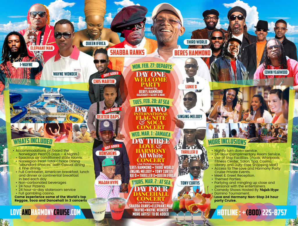 On February 27th to March 3rd, Love & Harmony Caribbean Cruise will host performances from Reggae & Soca’s most world renowned artists. The four-day concert will occur during the round trip voyage from Miami, Florida to Ocho Rios, Jamaica on the Norwegian Pearl cruise liner.