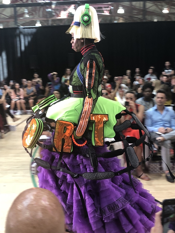 The show took you back to the balls that have gone on in the gay community for years in which everyone wears their fiercest outfit and vogues to the finish to see who is best. Well, I got all of that in this show and then some. It was festive, engaging in dance and burst of bright and bold colors from the first few looks that came down the runway to the last. It put you in the mood to party and Mardi Gras. The theme that stood out to me was the wonderful use of tulle. Tulle is very girly and flirty. It was layered, it was ruffled and bustled and beautiful. Print and texture was the other strikingly noticeable thing about this fashion brigade. Headphones and cute mini clutches in an array of colors as well, made each look complete. The use of neon with primary colors was a great touch and a beautiful way to make the outfit stand out.