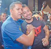 DOUBLE TRIUMPH: Chutney Soca Monarch and Traditional Monarch champions Rikki Jai (Samraj Jaimungal) and Ravi B (Ravi Bissambhar) celebrate after being crowned at Skinner Park, San Fernando on Saturday night. —Photos: DEXTER PHILIP