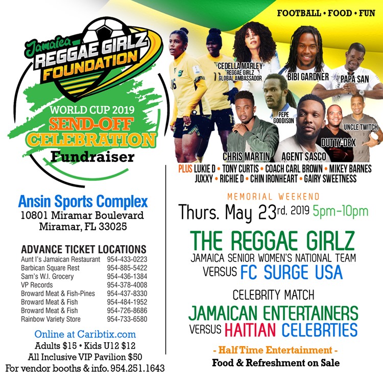 Thursday, May 23 Reggae Girlz 2019 World Cup Send-Off Fundraiser “Fun-Day Celebration” – featuring the double header matches.The Jamaica National Women’s Team vs FC Surge USA & The Jamaican entertainers Celebrity Team vs. Haitian Entertainers Team.