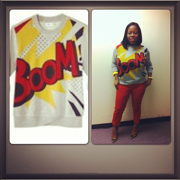 Phillip Lims latest collection just hit the stores this week.  His style can be described as classic with a sense of madness. His knack is for giving accessible, wearable clothes that little something extra.  His collaborative collection with Target is filled with whimsical clothing and accessories for women and men—and prices start at $19.99.  The “Boom” sweatshirt is really more of a “swagshirt”!  It’s fun, colorful and animated.  Depending on your level of fashion forwardness, this piece can be worn casually with the matching sweat pants or ‘turnt’ up with a trendy twist like Dawn has done.  She paired the Boom “swagshirt” with fire red skinny jeans, bright popping accessories and vintage Chanel ‘stylettos’!  Not only does it look good, but she didn’t break the bank for designer duds.  She did that…Boom!