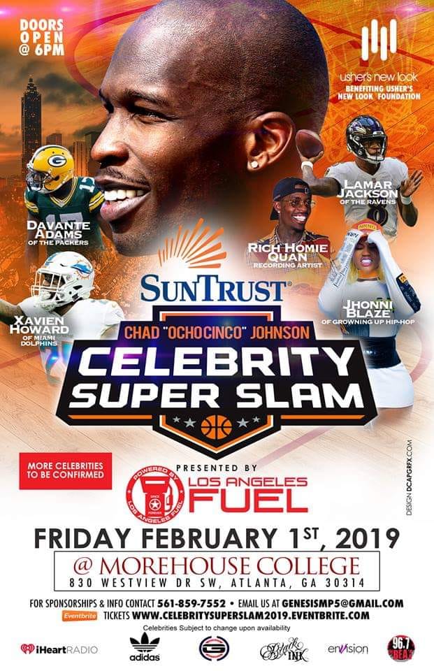Join former NFL great Chad “Ocho Cinco” Johnson on Friday February 1st 2019 for his SUNTRUST Celebrity SuperSlam Charity basketball game presented by LOS ANGELES FUEL. The game will take place at the Forbes Arena on the Campus of Morehouse College in Atlanta. The game will feature Chad, current and former NFL players, Hollywood celebrities, reality stars, social media influencers and media personalities some of which includes Jarvis Landry of the Browns, Davante Adams of the Packers, Lamar Jackson of the Ravens, Pierre Garcon of the 49ers, former Atlanta Falcon Jamal Anderson, Love and Hip Hop star Julu Castenda, Ceaser and Teddy of VH1’s Black ink Crew, Kendrick Sampson of HBO’s Insecure and many more. Proceeds from the event benefits Usher’s New Look Foundation.