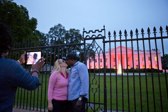 Tourists have their picture taken in front of the White House, Oct. 1, 2012. The North Portico of the White House is illuminated pink in honor of Breast Cancer Awareness Month. (Official White House Photo by Sonya N. Hebert)