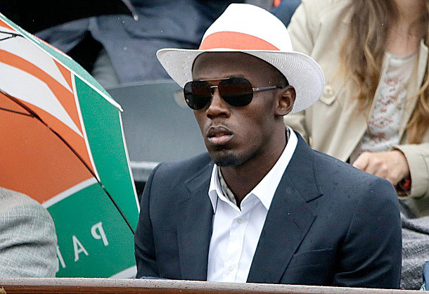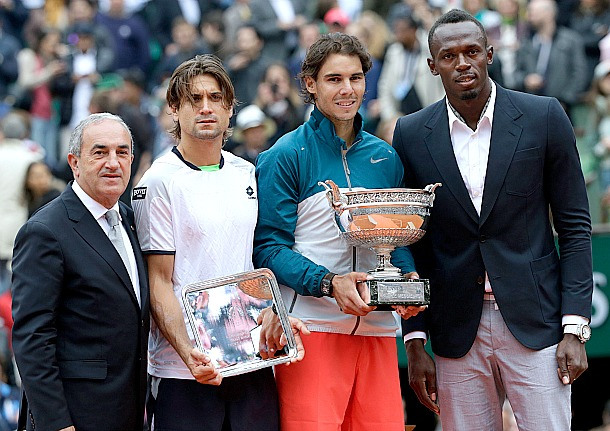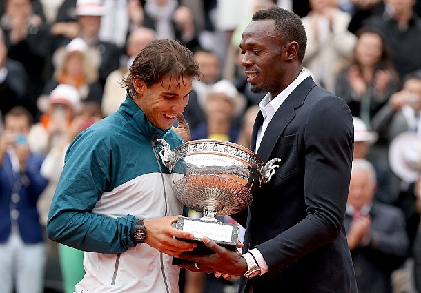 Fresh off a surprise defeat to Justin Gatlin at the Golden Gala meet in Rome last week, the world’s fastest man, six-time Olympic gold medalist Usain Bolt was in Paris for the French Open on Sunday to present the Coupe des Mousquetaires to Rafael Nadal, who defeated David Ferrer 6-3, 6-2, 6-3 in a rain-addled final.