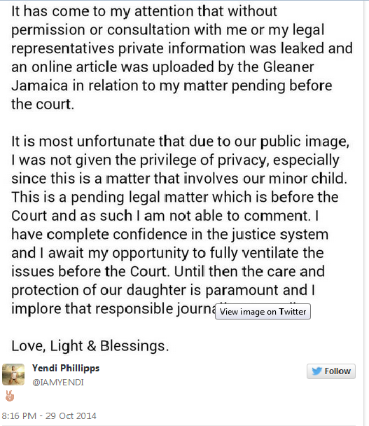 UPDATE 10/31/14: Yendi Phillips claims private information was “leaked” without her permission leading to the Jamaica Gleaner story regarding her custody battle: